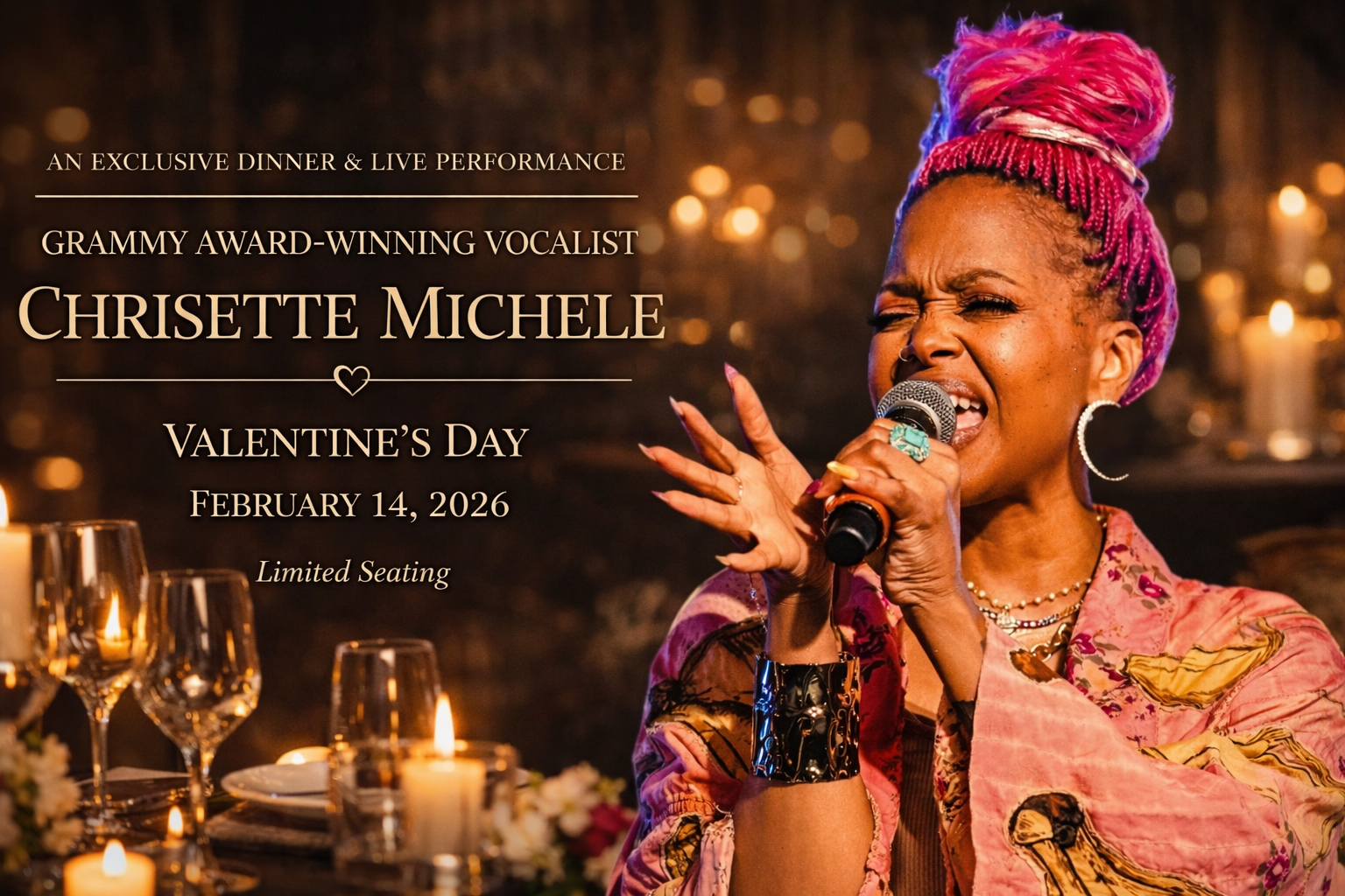 Presented by Keltra Productions, The Lover’s Experience is a luxury Valentine’s Day celebration curated for couples seeking an elegant, romantic, and unforgettable evening. This is not a casual concert — it is an upscale dining and live performance experience designed to celebrate love in its most refined form. Guests will enjoy an intimate, candlelit setting where fine dining meets live music in a sophisticated atmosphere. Every detail has been carefully curated to create a premium, immersive, and emotionally engaging experience. Elegant evening attire is encouraged. This is a refined Valentine’s experience designed for couples who appreciate romance, class, and exclusivity.